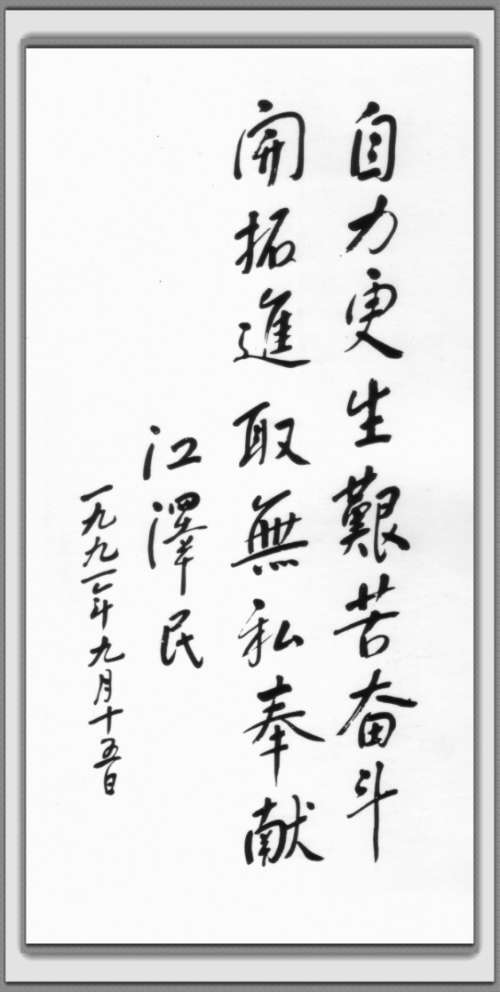1991年9月15日,正值人民兵工創建60周年之際,江澤民同志為人民兵工題詞:自力更生,艱苦奮斗,開拓進取,無私奉獻。