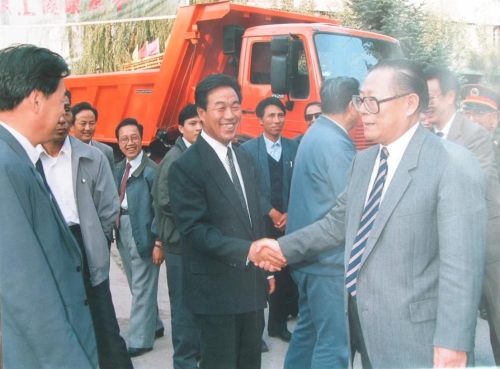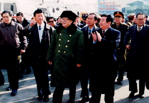 1990年9月25日,江澤民同志到兵器工業617廠視察,圖為考察北奔重卡時的場景。